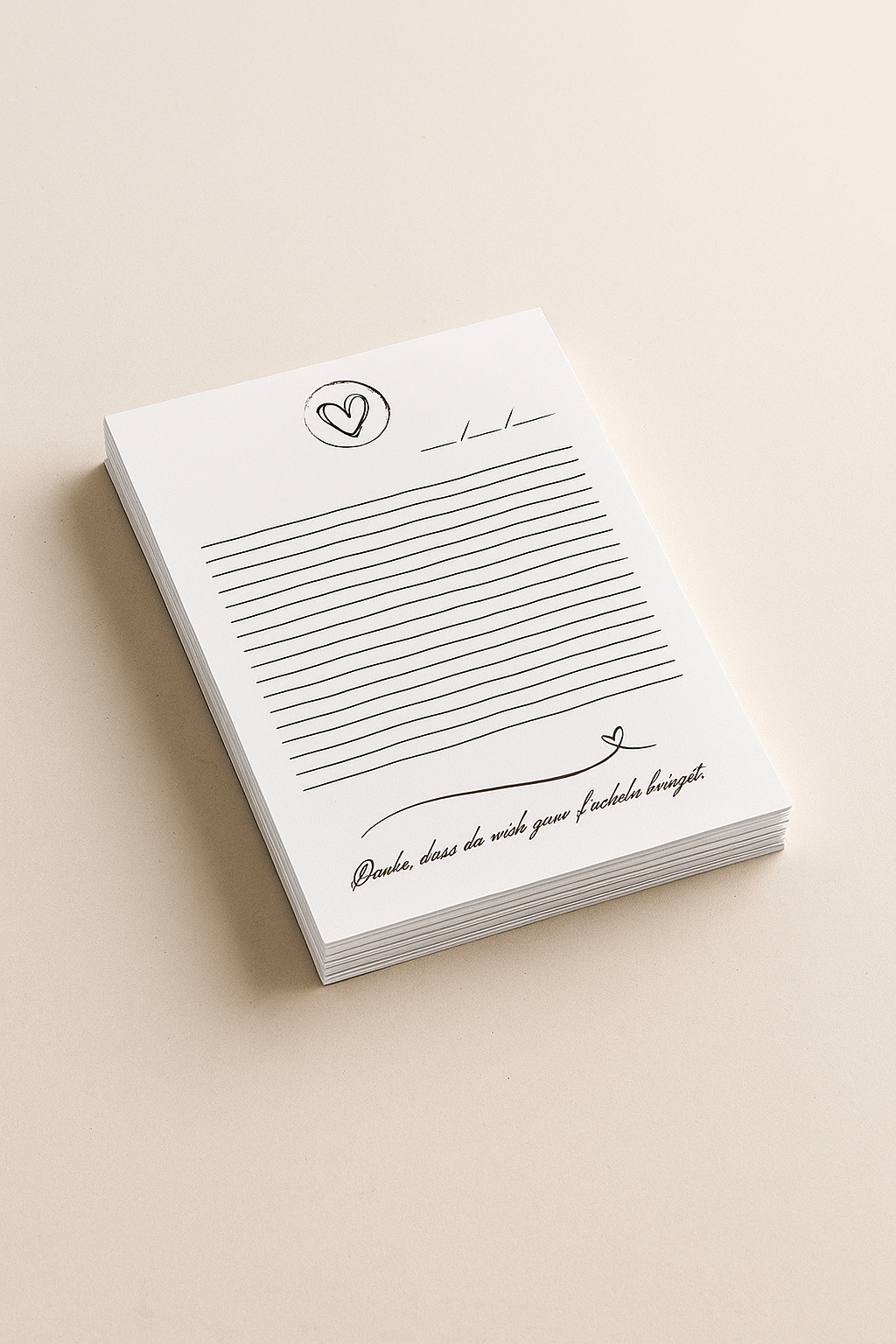 Der Lailys Notizblock begleitet dich bei jedem Gedankenblitz: Ob To-do-Liste, Dankesbotschaft oder kleine Erinnerung – 60 liebevoll gestaltete Seiten warten darauf, mit Leben gefüllt zu werden. Jeder Block wird von Hand geleimt, erhält zum Abschluss unser Herz-Siegel und kommt sicher verpackt zu dir nach Hause.